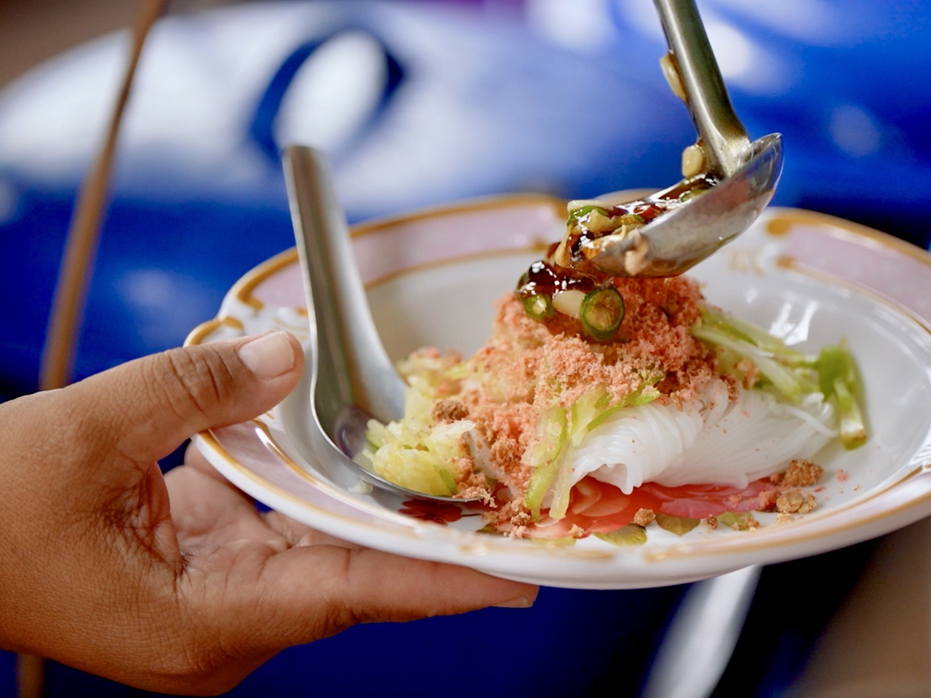 “เที่ยวฟินกินฉ่ำ” สัปดาห์นี้ 2 พิธีกรคู่หู “มาวิน ทวีผล” และ “บุช เลอชาญ” ขอมัดรวมทุกร้านเด็ดที่เป็นเพชรเม็ดงาม ที่ชาวเมืองเพชรภูมิใจนำเสนอมาเพื่อคุณผู้ชม เริ่มกันที่ตลาดเช้าริมแม่น้ำเพชรที่มีความละมุนสไตล์ชาววัง กับ “ร้านข้าวแช่ป้าเอื้อน” อาหารสำรับชาววังสูตรแบบดั้งเดิม ขายอยู่ที่นี่มาตั้งแต่ปี 2502 ราคาน่ารักเหมือนเจ้าของร้าน 2 หนุ่มชิมแล้วชื่นใจสุดๆ ร้านถัดไปเดินไปไม่กี่ก้าวก็ถึงแล้ว กับอีกเมนูโบราณที่นับวันจะหากินยาก “แม่อ้อยขนมจีนซาวน้ำ” ร้านเก่าแก่ไม่แพ้กัน เมนูขนมจีนโบราณหากินยาก ขนมจีนแป้งสดเส้นหนึบๆ ราดด้วยหัวกระทิและน้ำตาลเมืองเพชรเคี่ยว ลอยด้วยพริกขี้หนู ตัดด้วยรสชาติเปรี้ยวหวานของสับปะรดและตะลิงปลิง ตบท้ายความนัวเค็มมันด้วยถั่วคั่วและกุ้งแห้งป่นคลุก หยำแล้วชิม บอกเลยว่าเป็นเมนูรสชาติวาไรตี้ล้ำลึกสุดๆ ราคาเพียงแค่ 30 บาทจบคอร์สตำรับเมืองเพชรแบบนุ่มนวลเย็นใจ ร้านต่อไป 2 หนุ่มขอกินแบบคนดุดัน สไตล์คนเพชรด้วย “ก๋วยเตี๋ยวกลับใจ” ซึ่งที่นี่ไม่ใช่แค่ร้านก๋วยเตี๋ยวแต่คือ พันทิปขนาดย่อม ใครมาถึงเป็นต้องไหว้เป็นตำนาน 70 ปี แห่งเมืองเพชร ที่คงความศักดิ์สิทธิ์ของรสชาติตั้งแต่รุ่นยาย กับเย็นตาโฟเครื่องแน่นปรุงมาอย่างดี เส้นนุ่มมาพร้อมกับหมูแดง ตับ เลือด หมึกกรอบ ลูกชิ้น เหยาะซอสเย็นตาโฟสูตรทางร้าน โรยกากน้ำมันเจียวทำเอง น้ำซุปร้อนๆ ที่เคี่ยวปรุงอย่างดี ตบท้ายด้วยพระเอกคนสำคัญ “ปาท่องโก๋ทอดกรอบ” ที่คนเพชรเขาบอกว่าเข้ากันมากต้องมาลอง ไปกันต่อกับร้าน “โอ้วทึ้งนายกี๋” ลอดช่องน้ำตาลข้น ขวัญใจชาวน้ำตาลโตนดเลิฟเวอร์ เมนูความหวานเจี๊ยบ ชุ่มคอชื่นใจสไตล์คนเพชร ลอดช่องน้ำตาลข้นเมนูลอดช่องที่จัดเรียงใส่แก้วกันแบบเป็นขั้นเป็นตอน หวานละมุนลอดช่องหนึบ ยังมูฟออนจากเมนูเส้นไม่ได้ 2 หนุ่มขอไปลุยกันต่อที่ร้าน “ก๋วยเตี๋ยวน้ำพุ” ร้านตัวท้อปอันดับต้นๆ ของเมนูก๋วยเตี๋ยวน้ำแดง ที่อยู่คู่เมืองเพชรบุรีมากว่า 60 ปี กับเอกลักษณ์การกินที่เป็นเสน่ห์ของก๋วยเตี๋ยวชาวเพชร ถ้าอยากอร่อยแบบถึงๆ ยังไม่ต้องปรุงแค่ราดซอสพริกลงไปในก๋วยเตี๋ยว ที่นี่ซอสพริกเขาปรุงจากพริกกะเหรี่ยงดองเพื่อสร้างความกลมกล่อมหอมฉุนเตะจมูกปิดจบแบบดุเดือดที่ “ร้านพวงเพชร” ร้านที่รับประกันเรื่องวัตถุดิบว่าสดทุกจาน ไม่สดไม่คิดเงิน เมนูที่เป็นประกาศนียบัตรของร้าน ปลาดุกทะเลหรือกระพงผัดฉ่า ผัดฉ่าที่พริกแกงทำเองเขียวเด้งท้าทายต่อมเหงื่อ รสชาติร้อนแรง กับหลากหลายเมนูที่ขนมาเสิร์ฟกันเต็มโต๊ะ ทั้ง หอยเสียบผ