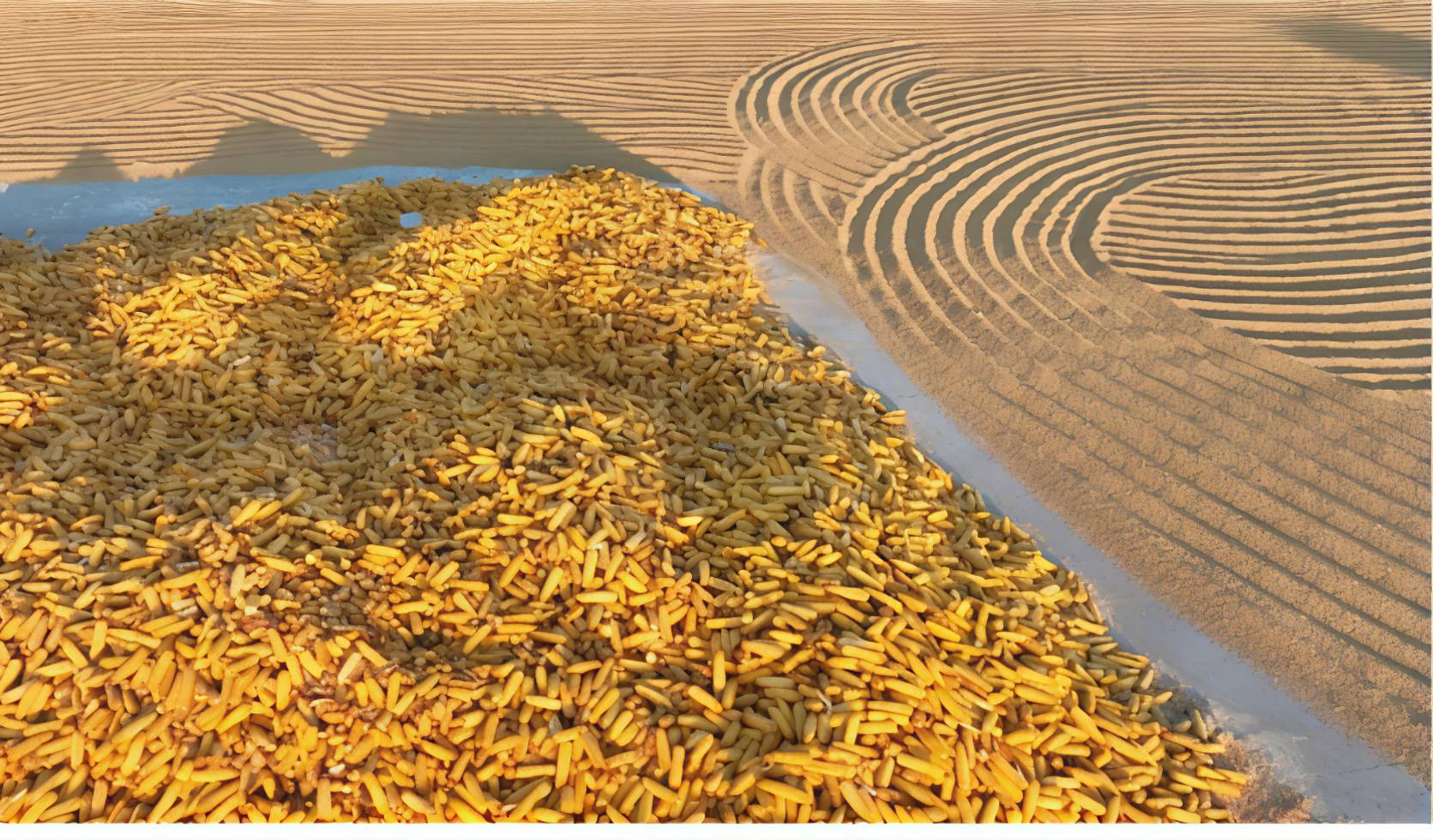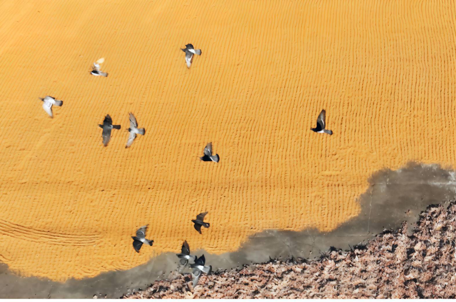 ทิวทัศน์ฤดูใบไม้ร่วงอันงดงามที่ลานนวดข้าวในเขตเป่ยหลิน เมืองสุยฮว่า มณฑลเฮยหลงเจียง (ภาพ หลิว เสี้ยนอู่บนลานนวดข้าวในเขตเป่ยหลิน เมล็ดข้าวโพดสีทองถูกเกลี่ยกระจายทั่วพื้น เปล่งประกายระยิบระยับภายใต้แสงแดด เหล่านกพิราบโฉบบินผ่านเหนือพื้นที่นวดข้าว ร่างอันพลิ้วไหวของมันตัดกับภาพของเมล็ดธัญพืช เกิดเป็นฉากแห่งความกลมกลืนของธรรมชาติ สะท้อนรายละเอียดของฤดูเก็บเกี่ยว