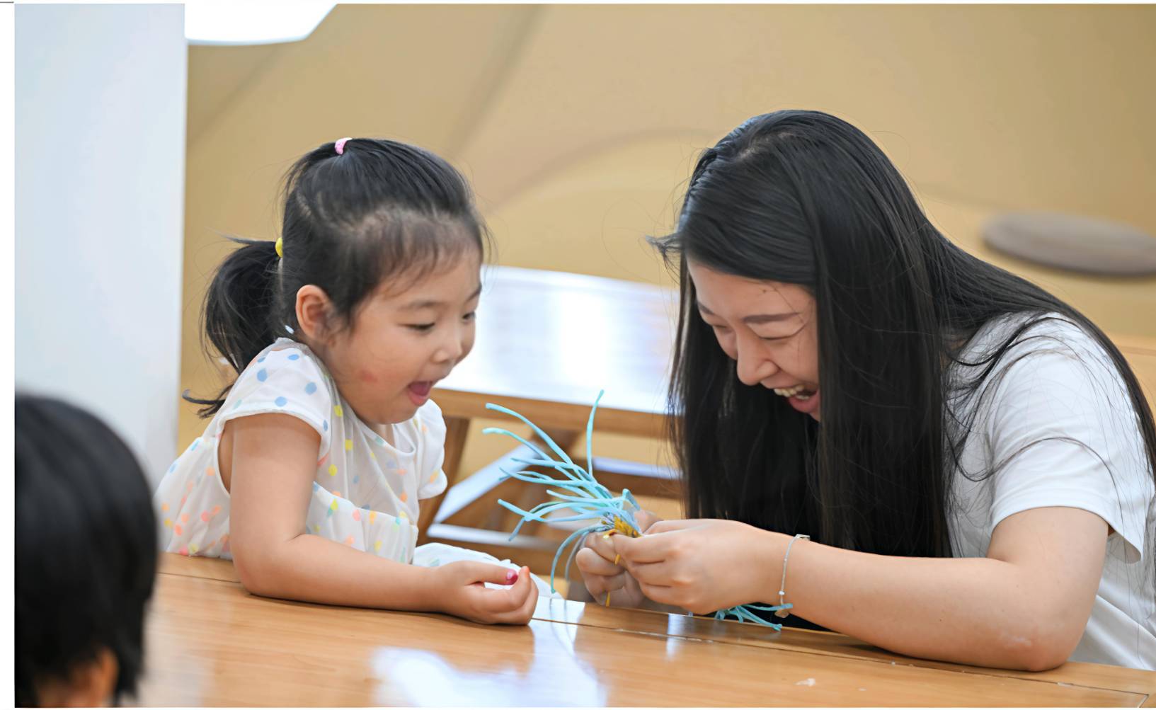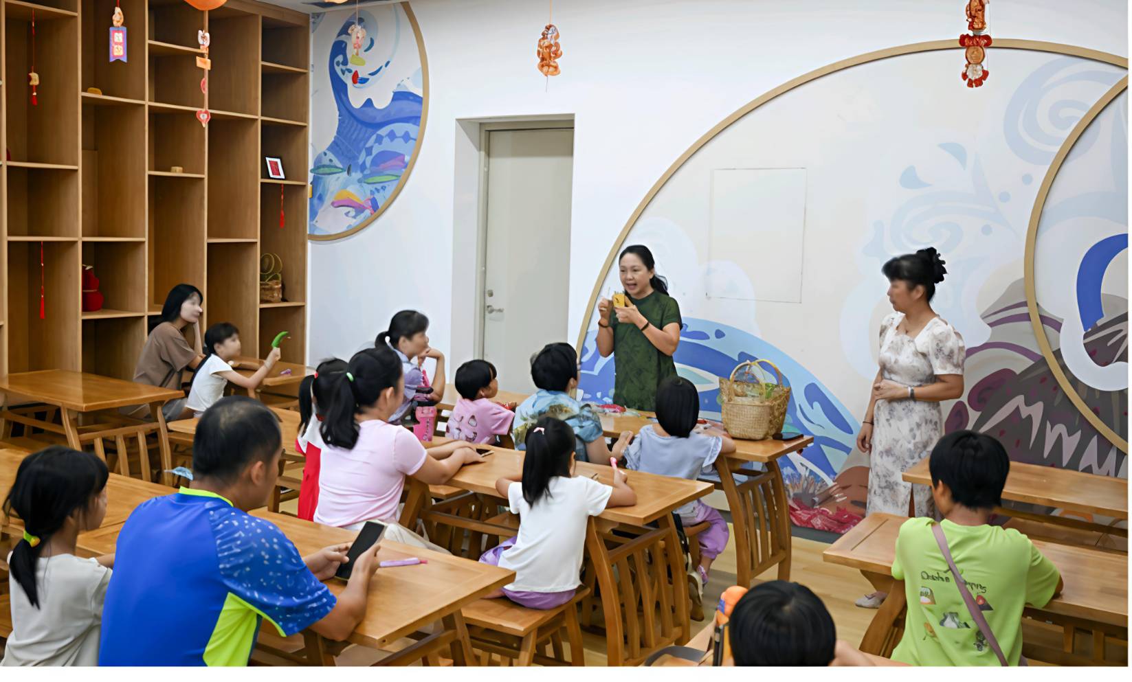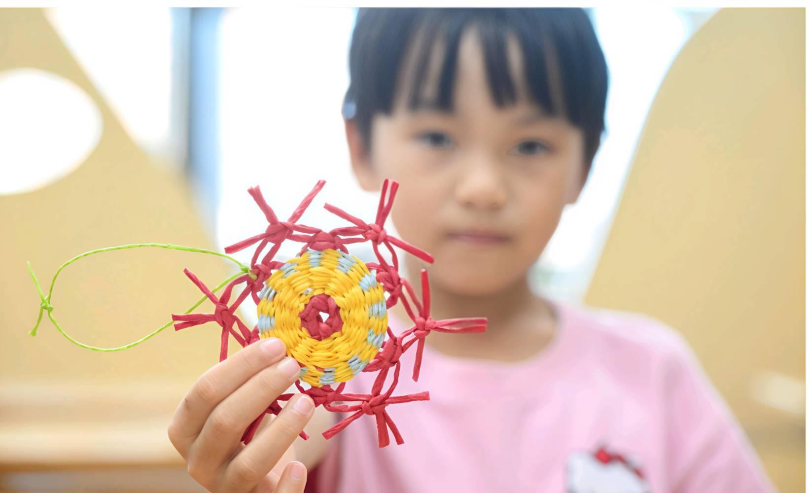 ผู้ปกครองและเด็กๆร่วมเรียนรู้ทักษะการสานหญ้าตงซานที่ศูนย์วัฒนธรรมมณฑลไห่หนาน (ซินหัว)