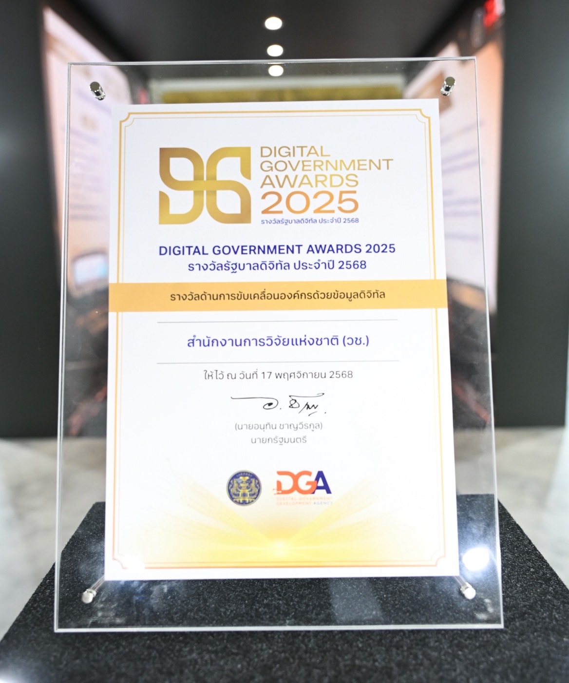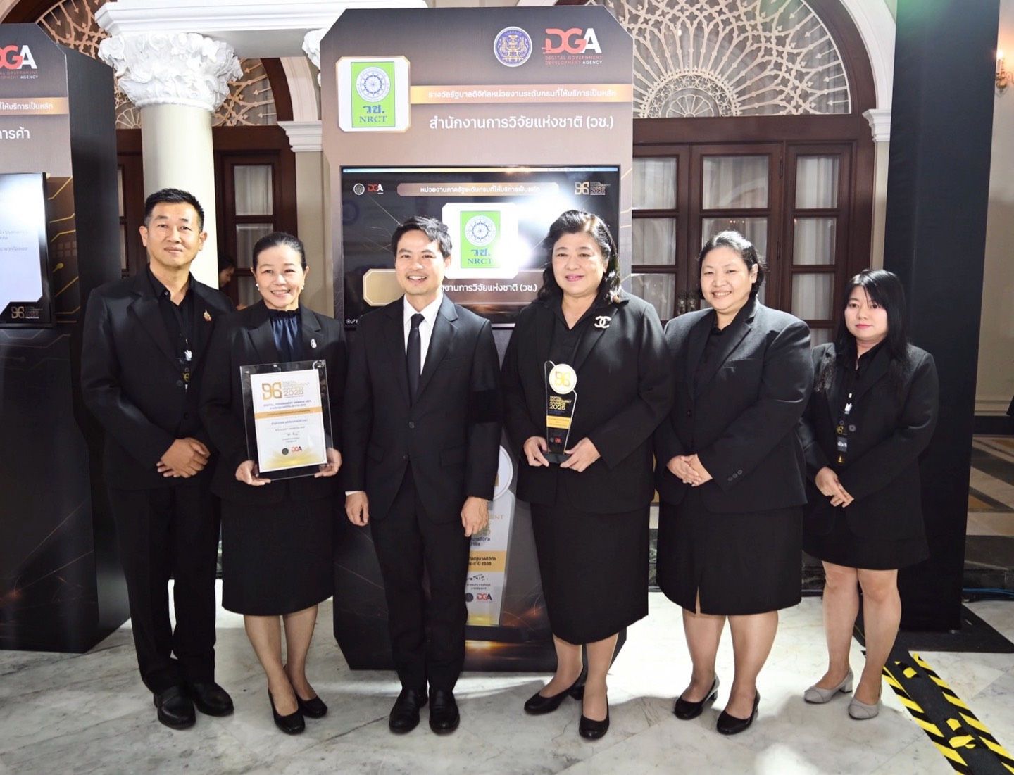 วันที่ 17 พฤศจิกายน 2568 สำนักงานการวิจัยแห่งชาติ(วช.) กระทรวงการอุดมศึกษา วิทยาศาสตร์ วิจัยและนวัตกรรม ร่วมพิธีรับรางวัลรัฐบาลดิจิทัล ประจำปี 2568 (Digital Government Awards 2025) จัดโดยสำนักงานพัฒนารัฐบาลดิจิทัล (องค์การมหาชน) โดยมี นายภราดร ปริศนานันทกุล รัฐมนตรีประจำสำนักนายกรัฐมนตรี เป็นประธานในการมอบรางวัลและประกาศเกียรติคุณ ซึ่งในปีนี้ ดร.วิภารัตน์ ดีอ่อง ผู้อำนวยการสำนักงานการวิจัยแห่งชาติ เข้ารับรางวัลอันดับ 1 รัฐบาลดิจิทัล หน่วยงานระดับกรมที่ให้บริการเป็นหลัก พร้อมนี้ นางมารยาท ตั้งมิตรเจริญ ผู้อำนวยการกองระบบและบริหารข้อมูลเชิงยุทธศาสตร์ ด้านวิทยาศาสตร์ วิจัยและนวัตกรรม วช.ยังเข้ารับรางวัลด้านการขับเคลื่อนองค์กรด้วยข้อมูลดิจิทัล อีกรางวัลด้วย ณ ตึกสันติไมตรี ทำเนียบรัฐบาล