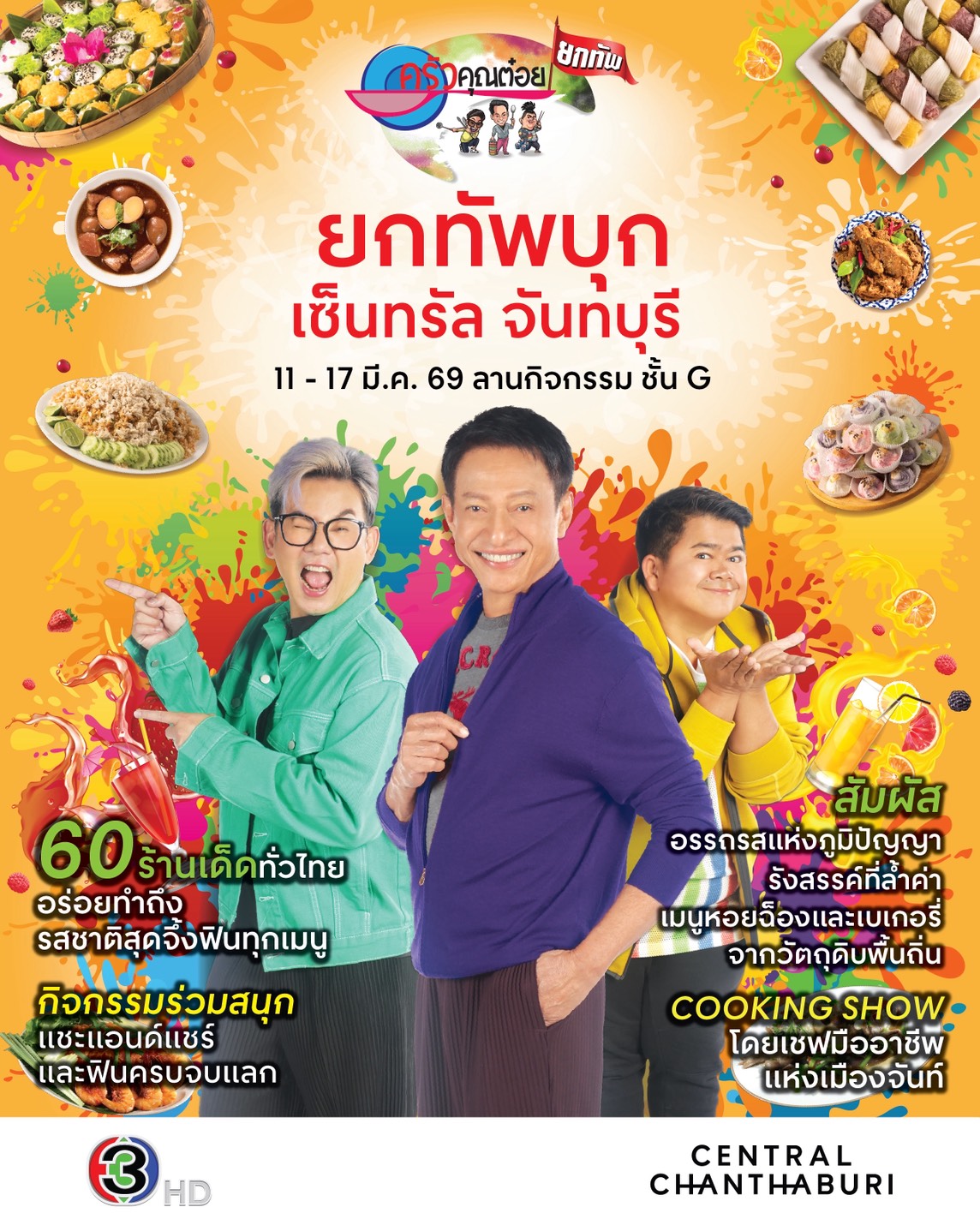 คุณตูน-พัทธยศ ลิมปพัทธ์” ในฐานะผู้จัดงาน ได้ยกทัพความฟินมาเติมใจสายกินถิ่นจันท์ ลิ้มลองรสความอร่อยสุดประทับใจ จากร้านเด็ดทั่วไทย ตลอด 7 วันเต็ม! ระหว่างวันที่ 11 – 17 มีนาคม 2569 ณ ลานกิจกรรม ชั้น G ศูนย์การค้าเซ็นทรัล จันทบุรีเต็มอิ่มกับ 60 ร้านมืออาชีพระดับตำนาน หลากหลายสไตล์ทั้งเมนูคาว หวาน ของว่าง ของฝากฟินได้ทุกวัยอาทิเช่น หมูยอวชาลิสา สูตรเวียดนามไม่ใส่แป้ง / นายเกาะ ข้าวเกรียบเห็ดหอม / บุษยาขนมไทย / แก้มใส เปาจี่ สไตล์ญี่ปุ่น / ครัวรสหนึ่ง หมึกย่างน้ำจิ้มรสเด็ด / ปาหนันผลไม้ / สองหนุ่มขนมเปี๊ยะปิ้ง / โกดังนัวส์ กุ้งแช่น้ำปลา / มาดามซอสเซส เนื้อพิคอนย่าทอดเนย / บ้านปลาทูมหาชัย ปลาทูซาเตี๊ยะ คัดสรรด้วยความตั้งใจโดยทีมงานครัวคุณต๋อยไฮไลท์สุดพิเศษ ในวันเปิดงานวันแรกพบกับ พิธีกรชื่อดังจาก “รายการครัวคุณต๋อย” นำโดย “อาต๋อย-ไตรภพ ลิมปพัทธ์” ”คุณโก๊ะตี๋ ชัยกฤต“ “คุณนก-สุภัทรพร นามปิติ” ผู้จะพาทุกท่านดื่มด่ำกับเรื่องราวความอร่อยของทุกร้านในงาน และร่วมถ่ายรูปกับผู้บริหารของเซ็นทรัลจันทบุรี และตื่นตา ตื่นใจกับกิจกรรม Cooking Show โดย 2 เชฟมืออาชีพแห่งเมืองจันทบุรี ที่จะมาสร้างสรรค์เมนูอร่อยสุดครีเอทจากวัตถุดิบพื้นถิ่นจันท์ ให้ทุกท่านได้ลิ้มลอง พิเศษสุด!! วันที่ 11 มีนาคม 2569 พบกับ “หอยฉ็อง” อาหารท้องถิ่นที่รังสรรค์จากภูมิปัญญาชาวจันท์อย่างแท้จริง โดยร้าน “ครัวป้าสาว” และ “เบเกอรี่จากวัตถุดิบพื้นถิ่นเมืองจันท์” ต่อยอดไอเดียสุดครีเอท โดยร้าน Butterful ที่จะมาสร้างประสบการณ์ความอร่อยให้ท่านเพียงวันเดียวเท่านั้น!!!สนุกกับกิจกรรม “ครัวคุณต๋อยอร่อยแชร์ไป” เพียงโพสต์รูปภาพในงานพร้อมติด #ครัวคุณต๋อยอร่อยแชร์ไป ตั้งโพสต์เป็นสาธารณะ รับคูปองส่วนลดช้อปสินค้าในงานมูลค่า 20 บาททันที ตั้งแต่วันที่ 11 – 15 มีนาคม 2569 (คูปองมีจำนวนจำกัด) ฟินครบจบเเลก เพียงช้อปอาหารในงาน “ครัวคุณต๋อย” ครบ 10 คะแนน ผ่านช่องทาง LINE รับไปเลยพวงกุญแจลิมิเต็ดครัวคุณต๋อย ทุก ๆ 100 บาท เท่ากับ 1 คะแนน ตั้งแต่วันที่ 11 – 15 มีนาคม 2569 (สินค้ามีจำนวนจำกัด) พบกับ “ครัวคุณต๋อยยกทัพ“ ที่ศูนย์การค้าเซ็นทรัล จันทบุรี บริเวณ ลานกิจกรรม ชั้น Gเวลาเปิด-ปิด ทุกวัน 10.00 น. – 21.00 น. สนับสนุนความสำเร็จโดย• ศูนย์การค้า เซ็นทรัล จันทบุรี• เมืองจันทบุรี• การท่องเที่ยวแห่งประเทศไทย สำนักงาน จันทบุรี• สถานีวิทยุโทรทัศน์ไทยทีวีสีช่อง 3 คุ้มค่าทุกนาที ดูทีวีสีช่อง 3ติดตามรายละเอียดได้ที่ FACEBOOK ครัวคุณต๋อย เว็บไซต์ www.kruakhuntoi.com แอปพลิเคชันครัวคุณต๋อย #ครัวคุณต๋อยยกทัพ #ครัวคุณต๋อย #ไม่กินถือว่าผิด #ประสบการณ์ที